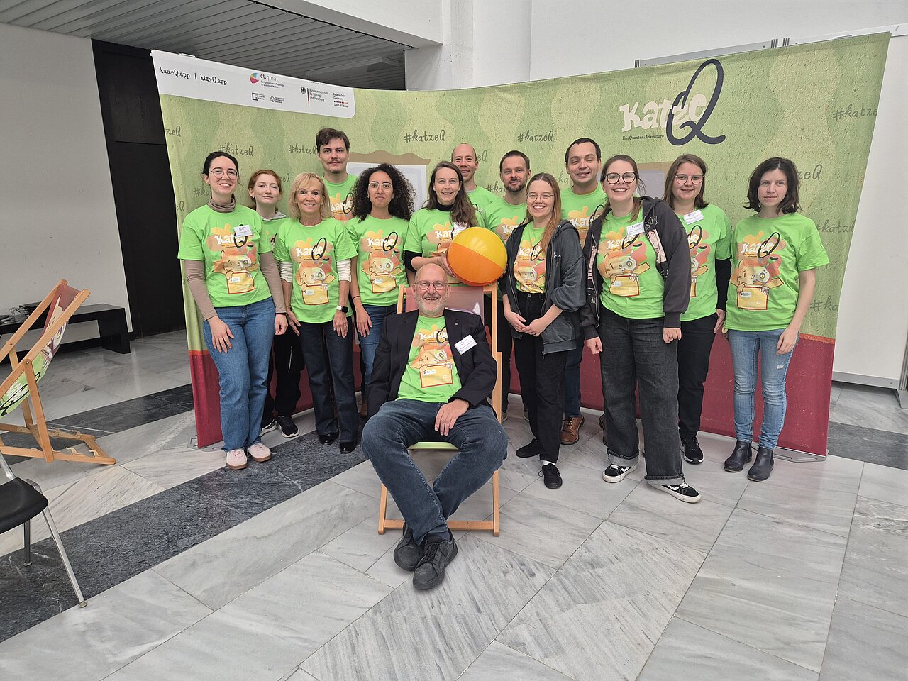 Ein besonderes Highlight wartete im Anschluss im Lichthof der Neuen Uni: In der „Katze Q Gaming Lounge“ tauchten die Kinder noch tiefer in die Welt der Quanten ein und entdeckten im „Quanten-Adventure“ zusammen mit Schrödingers Ur-Enkelin Anna und Katze Q die Quantenwelt auf spielerische Art. Am Stand nebenan durften sie Ausmalbilder und Quantenknobeleien mit nach Hause nehmen.