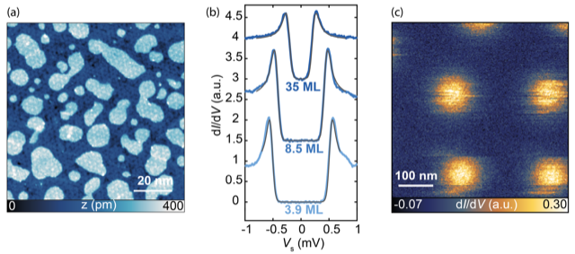Figure: (a) Constant-current STM topography of an 8.5 ML Al film on Si(111), (b) Superconducting gap spectra taken at T = 30 mK for samples with varying Al coverage, (c) Constant-contour dI/dV map in vector magnetic field, showing the Meservey-Tedrow-Fulde vortices for an 8.5 ML Al film.