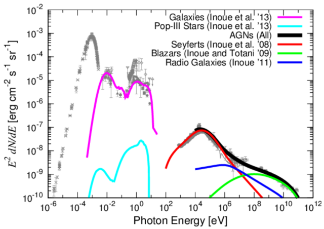 Fig. The cosmic background radiation spectrum from Inoue (2014). Here, the gamma-ray background is modeled only by contributions from different AGN types.