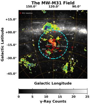 Fig. Expected halo size of the Andromeda galaxy (cyan), gas clouds along the line-of-sight and MW plane. Figure from Karwin et al. (2021).