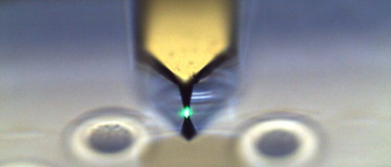 Das Ausgangsmaterial für fast alle unsere Nanostrukturen sind ultradünne einkristalline Goldflocken. Das nasschemische Wachstum dieser Einkristalle wurde in unserer Gruppe optimiert, so dass bei einer Dicke von einigen Dutzend Atomlagen noch laterale Abmessungen von bis zu 200 µm erreicht werden können. Aufgrund der kristallinen Homogenität kann eine hochpräzise Strukturierungsgenauigkeit erreicht werden und die resultierenden Strukturen haben sowohl ausgezeichnete optische als auch elektrische Eigenschaften. Die Flocken selbst sind natürlich auch selbst ein interessantes Forschungsobjekt und interessant im Hinblick auf Dickenabhängigkeit optischer Eigenschaften, vergleichbar zu 2D Materialien.