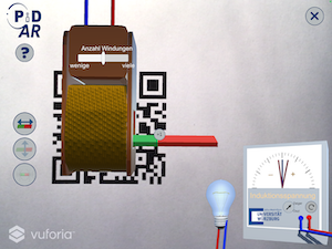 InduktionPiDAR ist ein AR-Applikation zum Thema Induktion. Sie ist einem realen Experiment mit einem Stabmagneten und einer Spule nachempfunden. Über deren relative Bewegung kann in der Spule eine Induktionsspannung erzeugt werden. Die Position der Spule wird in der App über einen Marker festgelegt, die Position des Magneten ergibt sich über die Position des mobilen Endgeräts. Bewegt man also z.B. das verwendete Tablet bezüglich des Markers, bewegt sich der Magnet bezüglich der Spule und induziert eine (virtuelle) Induktionsspannung.
