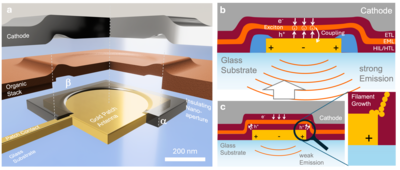Augmented Reality (AR) and Virtual Reality (VR), require miniaturized displays with ultrahigh pixel densities. Here, we demonstrate an individually addressable subwavelength OLED pixel based on a nanoscale electrode capable of supporting plasmonic modes. Our approach is based on the notion that when scaling down pixel size, the 2D planar geometry of conventional organic light-emitting diodes (OLEDs) evolves into a significantly more complex 3D geometry governed by sharp nanoelectrode contours. These cause (i) spatially imbalanced charge carrier transport and recombination, resulting in a low quantum efficiency, and (ii) filament growth, leading to rapid device failure. Here, we circumvent such effects by selectively covering sharp electrode contours with an insulating layer, while utilizing a nano-aperture in flat areas of the electrode. We thereby ensure controlled charge carrier injection and recombination at the nanoscale and suppress filament growth. As a proof of principle, we first demonstrate stable and efficient hole injection from Au nanoelectrodes in hole-only devices with above 90 % pixel yield and longtime operation stability and then a complete vertical OLED pixel with an individually addressable nanoelectrode (300 x 300 nm2), highlighting the potential to further leverage plasmonic nanoantenna effects to enhance the performance and functionality of nano-OLEDs.